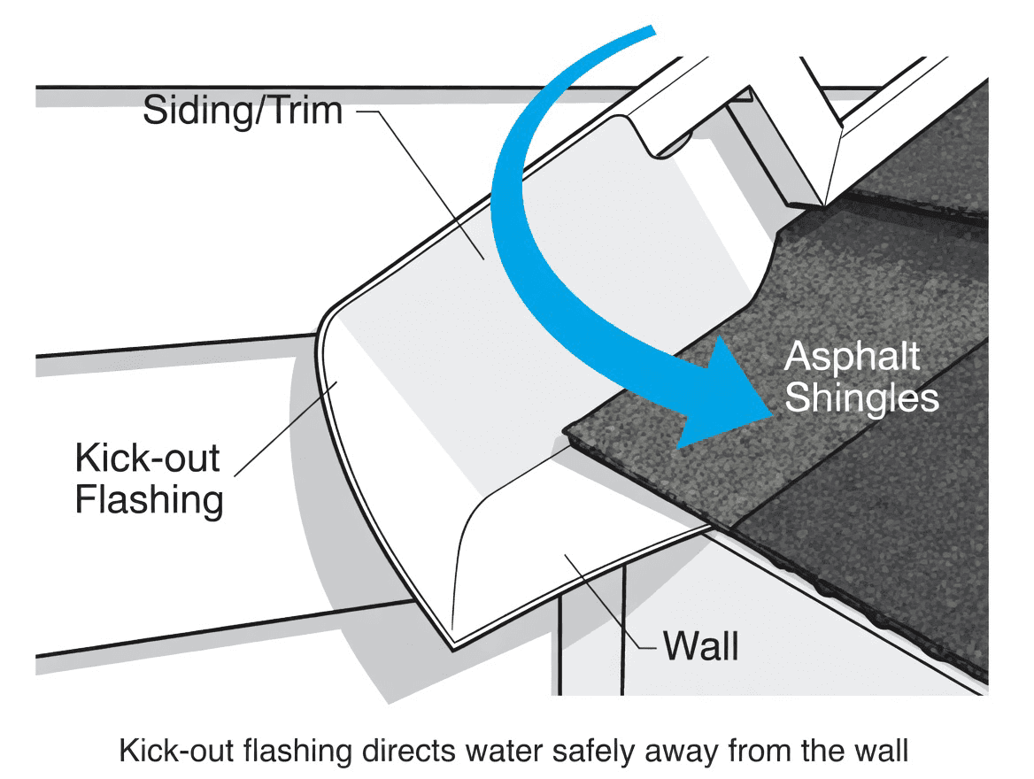 Ask your roofer or contractor to include kick-out flashing at every roof-rake-to-wall termination. Show them this article if needed—good crews already know it, but it never hurts to confirm.